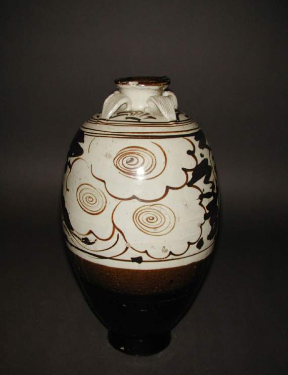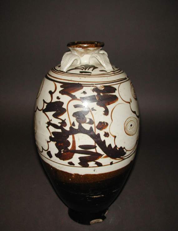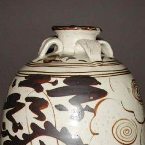整体造型:瓶为小口,短颈,丰肩,鼓腹,下腹渐收,圈足,肩部两侧有四个环形系,整体造型端庄稳重,线条流畅自然,符合金代磁州窑瓶类器物的典型造型特征,既具有实用的盛储功能,又兼具一定的装饰性,是金代日常生活中常用的瓷器之一。