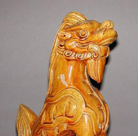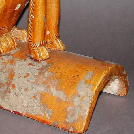 细节:瑞兽的头部雕刻细致,双眼圆睁,炯炯有神,嘴巴微张,露出牙齿,鬃毛和胡须刻画得线条流畅,富有动感。瑞兽的身体上装饰有精美的花纹,花纹线条简洁流畅,与瑞兽的造型相得益彰,凸显出瑞兽的神圣与威严。底座的釉面有部分磨损和剥落,露出里面的胎体,这是岁月和流传过程中留下的痕迹,也从侧面反映了这件文物的历史悠久。每一处细节都展现出明代琉璃工艺的精湛水平和艺术魅力。