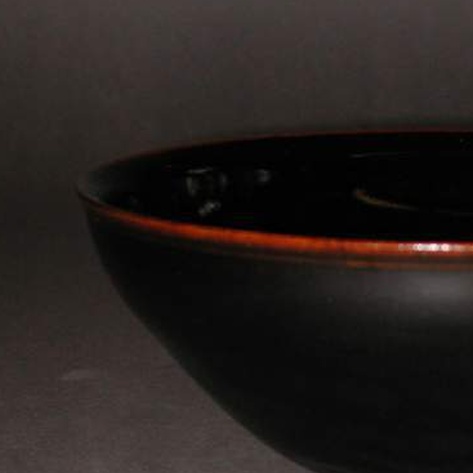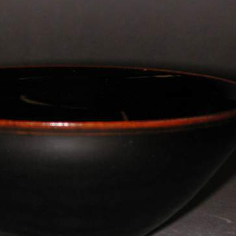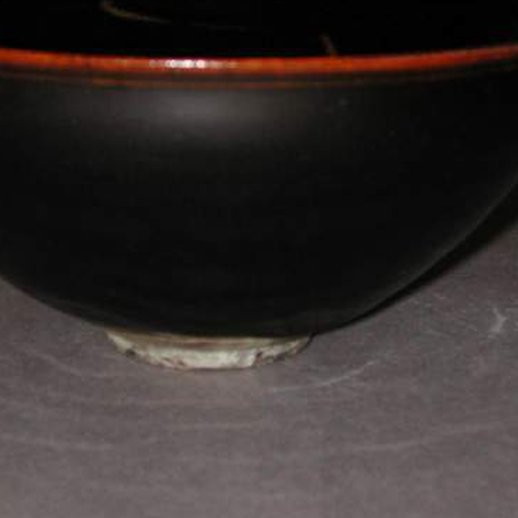 细节:盏口沿处釉层较薄,呈现出一圈棕红色,与乌黑的釉面形成鲜明对比,增添了器物的层次感。圈足部分修胎较为规整,底部露胎处能清晰看到其铁黑色的胎质,且有一些细微的窑粘痕迹,这是烧制过程中留下的自然印记,展现了手工制作的独特魅力和历史的沧桑感。