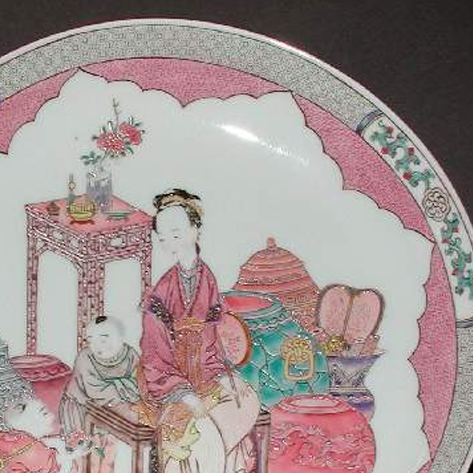 细节:盘的正面绘有仕女婴戏图,仕女形象端庄秀丽,神态安详,身着华丽的服饰,衣纹线条流畅自然,褶皱刻画细腻。婴孩们活泼可爱,或嬉戏玩耍,或围绕在仕女身旁,动作神态各异,充满生机与童趣。周围还辅以精美的家具、花卉等纹饰,家具的造型和纹饰细致入微,花卉的花瓣、枝叶等细节清晰可见,笔法细腻流畅。盘的边缘饰有一圈精美的锦地纹和花卉纹,锦地纹排列整齐,花卉纹栩栩如生,与中间的仕女婴戏图相互呼应,整体纹饰布局疏密有致,层次分明,每一处细节都彰显出清代雍正粉彩瓷器工艺的高超水准和艺术魅力。