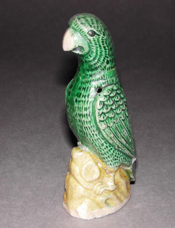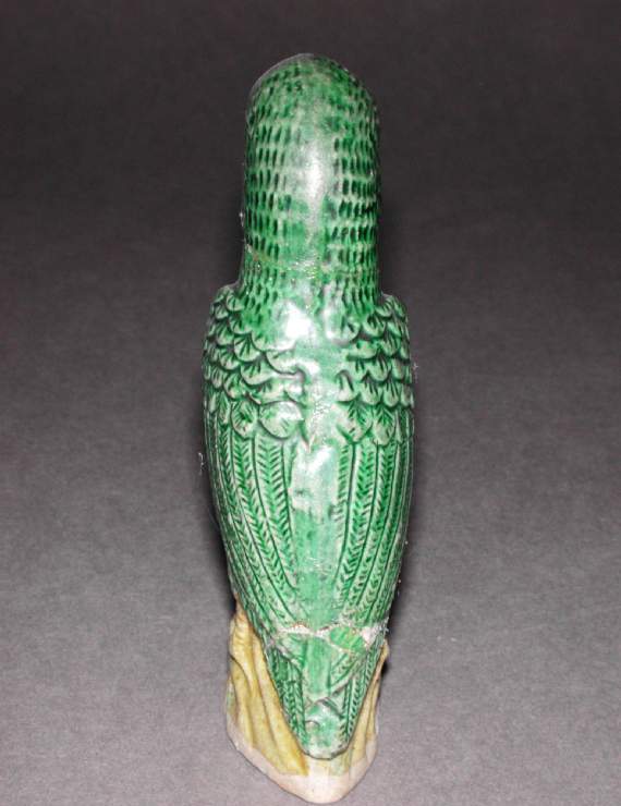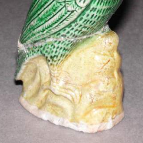 材质与色泽:采用优质瓷土烧制而成,胎体细腻坚致,密度高且质感厚重。鹦鹉主体施绿釉,釉色浓郁鲜亮,如同翡翠一般,给人以清新自然的感觉。底座施黄釉,釉色温润柔和,与绿色的鹦鹉形成鲜明对比,色彩搭配和谐雅致,展现出素三彩 “素雅、明快” 的典型特点。
