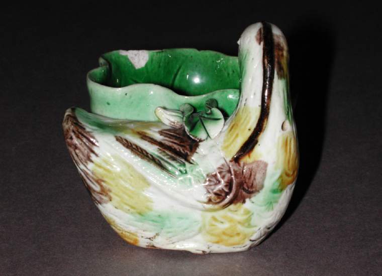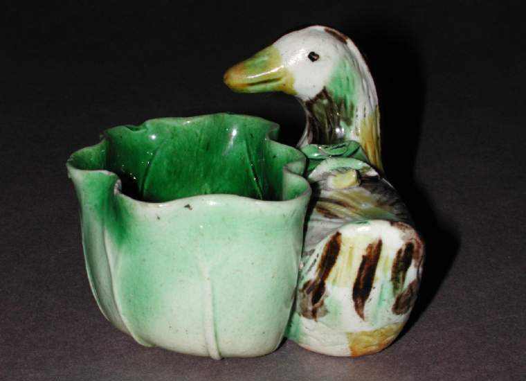 整体造型:水盂造型为一只鸭子与荷叶相结合的形态,鸭子造型生动逼真,身体蜷缩,头部微微抬起,嘴巴微张,仿佛正在戏水或鸣叫,姿态自然灵动。荷叶部分呈杯状,边缘模仿荷叶的自然卷曲形态,与鸭子的造型相得益彰,整体造型新颖别致,富有生活情趣和艺术感染力,是清代文房用具中颇具创意的作品。