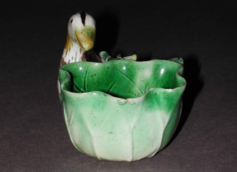 材质与色泽:采用优质瓷土烧制而成,胎体细腻坚致,密度高且质感温润。鸭子部分以粉彩绘制,色彩丰富,有黄、褐、绿、白等多种颜色,通过不同色彩的搭配和晕染,展现出鸭子羽毛的层次感和立体感,色彩过渡自然柔和。荷叶部分施绿釉,釉色从深绿到浅绿渐变,如同真实荷叶的色泽变化,鲜活生动,展现出粉彩瓷 “色彩艳丽、层次丰富” 的典型特点。