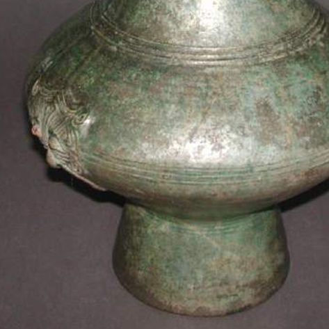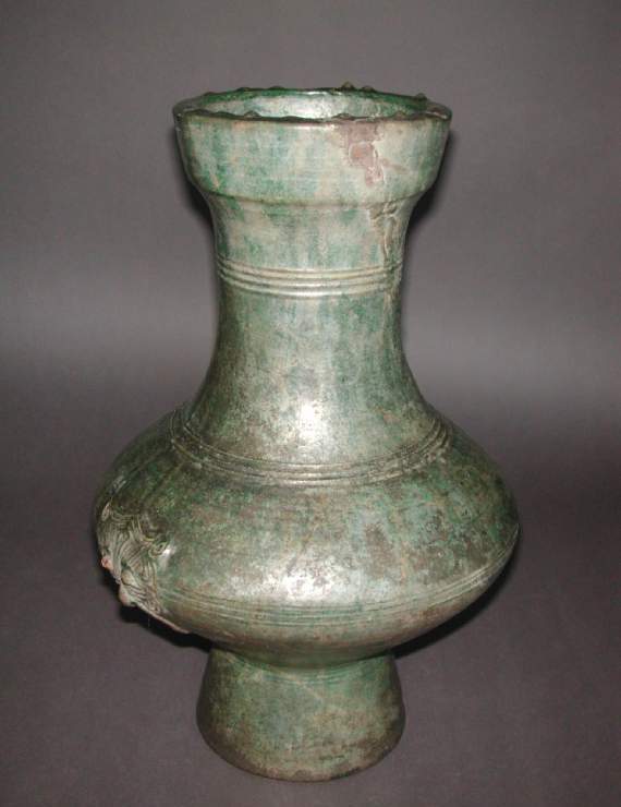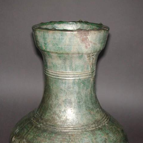 细节:壶的肩部装饰有铺首衔环,铺首为兽面造型,刻画得较为生动,环则与铺首相连,虽然环可能已缺失,但仍能感受到其原本的装饰效果。颈部和腹部有弦纹装饰,弦纹线条规整,增加了器物的层次感和装饰性。圈足部分处理较为规整,底部露胎处可见陶土的本色,与绿釉形成鲜明对比,尽显汉代陶器工艺的质朴与大气。