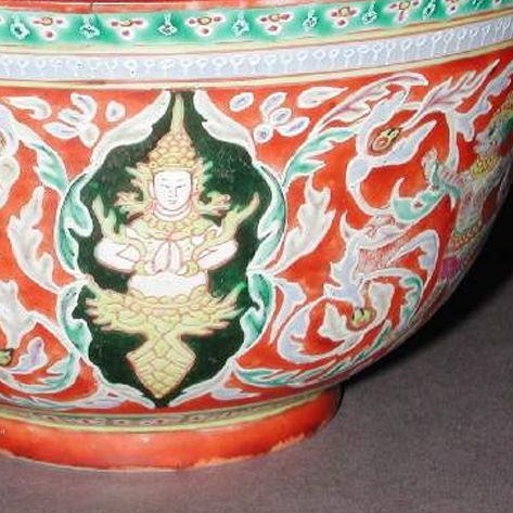 清代是中国瓷器发展的鼎盛时期之一,制瓷工艺在继承前代的基础上不断创新和发展。五彩瓷在清代达到了很高的艺术水准,其色彩丰富、对比强烈,装饰题材广泛,涵盖了人物、花鸟、山水、宗教等多个方面。佛教在清代社会中具有重要地位,宫廷和民间对佛教的信仰和尊崇使得佛像题材在瓷器装饰中较为常见。这种五彩描金佛像纹碗,不仅体现了清代高超的制瓷工艺,也反映了当时的宗教文化和社会风貌。 清代的瓷器生产主要集中在景德镇等地区,这里汇聚了大量技艺精湛的工匠,他们通过精湛的技艺和创新的设计,生产出了无数精美的瓷器,不仅满足了国内宫廷和民间的需求,还大量出口到海外,对世界陶瓷文化的发展产生了深远影响。然而,近代以来,由于列强的侵略,大量清代珍贵文物流失海外,这件五彩描金佛像纹碗的流失,是中国文化遗产的重大损失,也时刻提醒着人们要铭记历史,加强对文物的保护与追索。