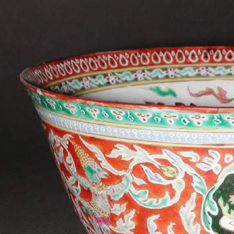 材质与色泽:选用优质瓷土烧制,胎体细腻坚致。碗身以红色为底色,色彩鲜艳夺目,在此基础上运用五彩工艺,搭配绿、白、金等多种色彩,五彩斑斓,绚丽多姿。描金工艺的运用,使得纹饰在色彩之外增添了华贵之感,整体色泽丰富且富有层次感,彰显出皇家的富丽堂皇与庄重典雅。