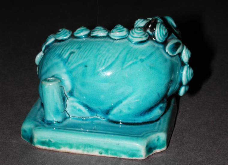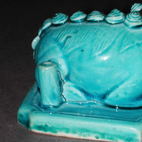 整体造型:瓷塑为狮子造型,狮子呈趴卧姿态,身体圆润饱满,头部微微抬起,嘴巴大张,造型生动传神,展现出狮子的威严与灵动,是清代常见的瑞兽瓷塑造型,具有祈福、辟邪的寓意。