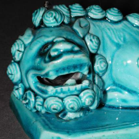 细节:狮子的头部雕刻细致,眼部、鼻部等五官清晰,鬃毛部分以卷曲的纹路呈现,每一处卷曲的鬃毛都刻画得极为规整,富有层次感。狮子的身体上也有细微的纹路,模拟狮子的毛发质感,线条流畅自然。底座为六边形,造型简洁,与狮子的造型相协调,底座部分也施有孔雀蓝釉,与狮子主体的釉色相呼应,整体细节处理精湛,彰显出清代彩瓷工艺的高超水准和艺术魅力。