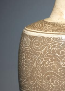 本品规格为直径12.7厘米,高度41.3厘米。整体造型修长优雅,瓶口部分为一个宽阔的盘口,便于倾倒液体或放置物品。瓶颈细长,连接着圆润饱满的瓶腹,瓶腹以下逐渐收窄,底部为圈足,支撑起整个瓶身,使器物显得稳重端庄 。瓶身腹部及部分区域采用刻花工艺,刻有缠枝花卉纹。纹饰线条流畅细腻,缠枝婉转灵动,花卉造型栩栩如生,富有生机。这些刻花纹饰增加了器物的层次感和艺术美感,体现了北宋工匠高超的制瓷技艺和审美水平。同时,刻花部分与白釉底色形成微妙的视觉对比,使纹饰更加突出。