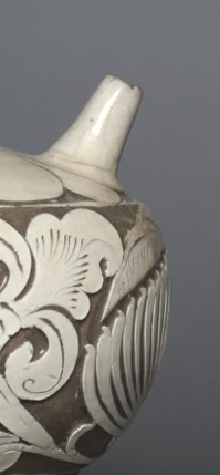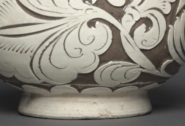 本品规格为直径15.9厘米,高度17.6厘米。整体造型优美,壶口为直口,短颈,壶腹圆润饱满,呈球形。底部有圈足,为壶身提供稳定支撑。一侧设有弯曲的执柄,方便持握;另一侧是细长的流口,用于倒出液体,流口的设计流畅自然,符合实际使用需求。采用剔花工艺进行装饰,腹部主体纹饰为牡丹纹,牡丹花瓣舒展,线条流畅细腻,富有层次感和动感。花纹周围剔去部分釉层,露出深色胎体,与白色的牡丹花纹形成鲜明对比,使纹饰更加突出。此外,在壶身其他部位可能还装饰有一些辅助性的花卉或卷草纹饰,进一步丰富了整体的装饰效果。