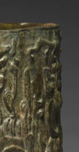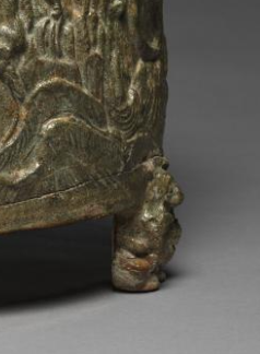 本品规格为直径27.3厘米,高度26.7厘米。整体呈圆筒状,直壁,敞口,底部由三只雕刻成神兽造型的足支撑,使得器物微微腾空,增添了稳重感与灵动性。器身表面采用浮雕工艺,刻有精美的神兽纹图案,神兽造型生动,姿态各异,或奔腾、或盘踞,线条流畅且富有张力。此外,还能看到一些云气纹等辅助纹饰,与神兽纹相互映衬,营造出神秘而奇幻的氛围,展现了东汉时期高超的青铜铸造与雕刻技艺。