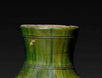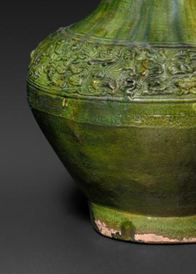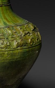本品规格为直径35.6厘米,高度44.5厘米。整体呈典型的壶形,口部略收,颈部较细长,溜肩,鼓腹,腹部以下逐渐内收,底部为圈足,造型端庄稳重,线条流畅自然,符合东汉时期陶器的造型风格。肩部采用模印工艺装饰有瑞兽纹,瑞兽造型生动,姿态各异,周围还伴有云纹等辅助纹饰,图案布局疏密有致,雕刻细腻,展现出东汉时期陶器装饰工艺的精湛水平,瑞兽纹在当时也承载着祈福辟邪等美好寓意。