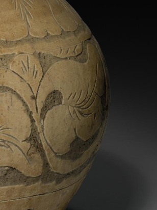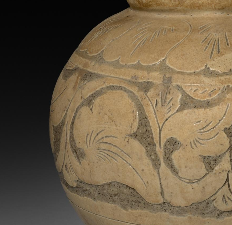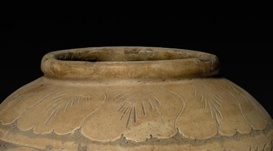 本品规格为27.4 厘米。这件辽代陶罐整体造型为圆腹,敛口,口沿部分较为窄小 。陶罐主体以土黄色陶土制成,表面质地略显粗糙,带有岁月留下的古朴质感。陶罐的肩部和腹部装饰有精美的刻花纹饰,其中肩部刻有类似花瓣形状的纹样,而腹部则刻有形态逼真的牡丹花纹样,线条流畅,展现出辽代工匠精湛的雕刻技艺 。纹饰部分与罐体底色略有差异,可能是烧制过程中形成的色差,也增添了几分独特韵味。