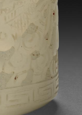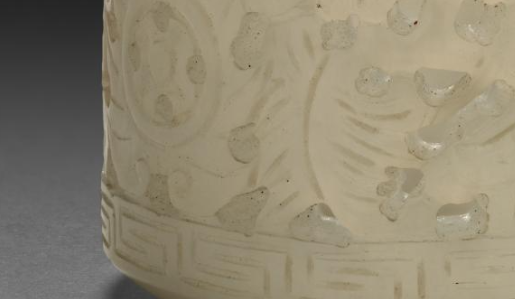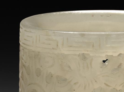 本品规格为6.8 厘米。由白玉制成,玉质温润细腻,色泽洁白,带有玉石特有的柔和光泽,尽显玉石的高雅质感。整体呈圆筒状,为典型的扳指造型。扳指表面采用镂雕工艺,雕刻有瑞兽等纹样,瑞兽形态生动,周围辅以花卉、卷草等纹饰,线条流畅自然,雕刻工艺精湛,将瑞兽的神态与周围纹饰的细节刻画得栩栩如生,整体富有层次感与艺术美感,展现出民国时期玉雕工艺的水平。