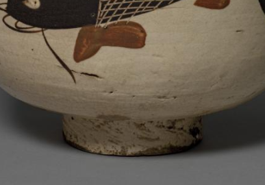 本品规格为直径27.4厘米。高度16.4厘米。此碗口沿外撇,碗壁呈弧形,斜直向下收至圈足,整体造型饱满大气。圈足较矮,底部平稳,放置时较为牢固 。以白色为底色,属于典型的磁州窑白地装饰风格。碗外壁绘制有一条生动的大鱼,采用黑彩描绘鱼的轮廓、鱼鳞以及鱼鳍等细节,其中鱼鳞部分以细密的网格线表现,质感强烈;鱼鳍、鱼尾等部位用褐彩进行点缀,增加色彩层次。鱼的造型写实,线条流畅,栩栩如生,周围还以简洁的黑彩笔触绘有类似水草的图案,增添了画面的生动感。虽然历经岁月,表面有些许磨损痕迹,但更增添了古朴的韵味。