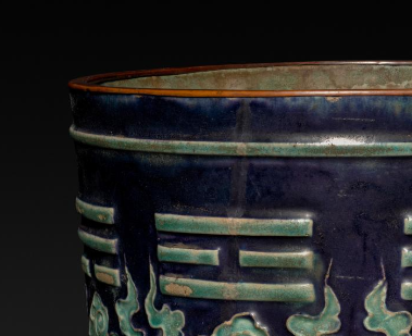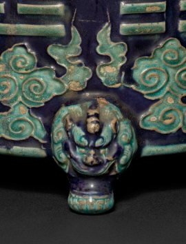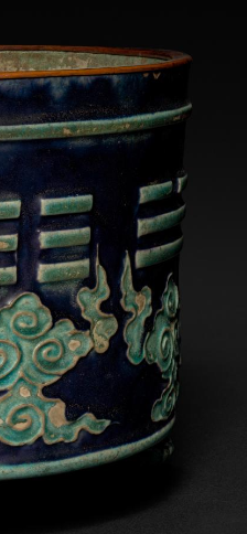 本品规格为直径19.8 厘米,高度15.3厘米。这件三足炉呈圆形直筒状,口沿边缘略厚,炉身施深蓝色珐华彩釉,色泽深沉而浓郁 。炉身中部装饰有凸起的八卦纹,线条规整,彰显古朴神秘之感;下部则饰以绿松色的云纹,云纹造型飘逸灵动,仿佛随风翻卷 。炉身底部塑有三个兽首形足,兽首雕刻细腻,面目威严,给器物增添了稳重感与庄严感 。整体色彩对比鲜明,纹饰精美,工艺精湛。