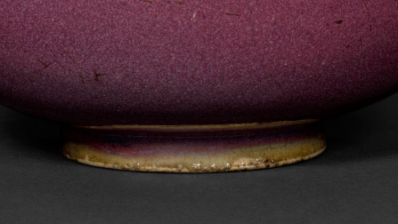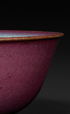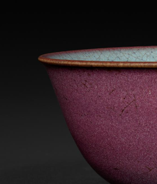 本品规格为直径19.4厘米,高度8.6厘米。该碗造型规整,口沿微敞,腹部圆润,下接圈足。碗身施仿钧窑的玫瑰紫釉,釉色浓郁艳丽,如玫瑰般呈现出迷人的紫色调,釉面带有自然的开片纹理,增添了古朴的质感。口沿处因釉层较薄,隐约可见胎体的颜色,与碗身的玫瑰紫釉形成色彩对比,整体呈现出典雅且富有艺术韵味的风貌。