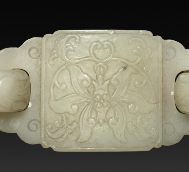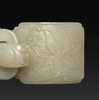 本品规格为17.6 厘米。由白玉制成,玉质温润细腻,色泽洁白,带有淡淡的油脂光泽,尽显玉石的高雅质感。整体呈对称布局,由多个部分组成,中间主体部分为方形,两侧各有一个带扣部件。各部分表面均雕刻有精美的花卉纹样,花卉造型优美,花瓣、花叶等细节刻画细腻,线条流畅婉转,充满了灵动的美感,周围还辅以卷草纹等装饰,使整体纹饰更加丰富饱满。带扣的结构设计精巧,能够灵活扣合,既具有实用性,又不失艺术观赏性。