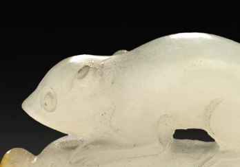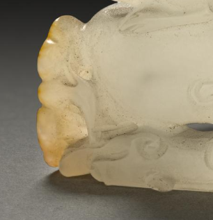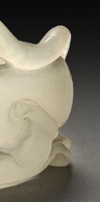 本品规格为直径4.2厘米,高度2.8厘米。由白玉制成,玉质温润细腻,色泽洁白,部分区域带有淡淡的黄色沁色,增添了器物的古朴韵味与层次感,尽显玉石的高雅质感。整体雕刻成一只瑞兽伏于枝蔓之上的造型。瑞兽形态生动,线条流畅自然,将瑞兽的身形、神态刻画得栩栩如生,瑞兽口中似衔有枝条,枝蔓造型婉转曲折,细节丰富,与瑞兽相互映衬,整体雕刻工艺精湛,展现出清代玉雕工艺的高超水平与艺术创造力。