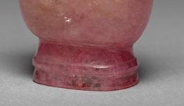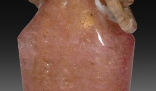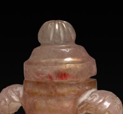 本品规格为6.1 厘米。由碧玺制成,碧玺呈现出粉嫩的色泽,质地温润,带有自然的纹理与光泽,整体给人一种晶莹剔透的感觉,尽显碧玺材质的珍贵与美丽。整体造型为瓶式,瓶颈两侧有双兽耳装饰,兽耳雕刻生动形象,富有立体感。兽耳上还套有活环,增添了灵动之感。瓶身线条流畅,瓶底为圆形,瓶盖与瓶身相契合,整体设计精巧,工艺精湛,展现出高超的雕琢技艺。