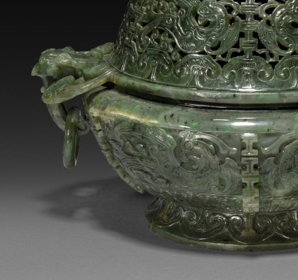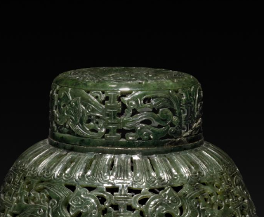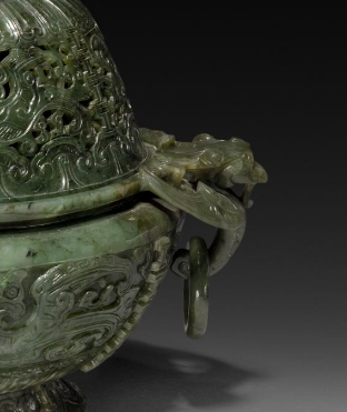 本品规格为17.6 厘米。这件文物以碧玉雕琢而成,整体造型庄重典雅。炉身呈圆形,腹部较为饱满,下承圈足。炉身两侧各有一只雕刻精细的兽首形耳,兽首威严生动,兽耳处套有活环,可自由转动。炉盖上同样运用了高超的雕刻工艺,布满镂空的龙纹等装饰,龙纹形态矫健,栩栩如生,镂空设计既增添了美感,又便于香气散发。炉身表面雕刻有精美的龙纹及其他辅助纹饰,线条流畅细腻,将龙的神韵展现得淋漓尽致。碧玉本身色泽温润浓郁,与精湛的雕刻工艺相得益彰,使得整器尽显华贵大气。