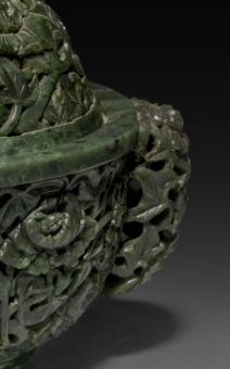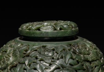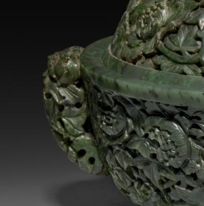 本品规格为14.6 厘米。该熏炉以碧玉为材质,整体呈圆形,由炉身和炉盖两部分组成。炉身两侧有精美的耳饰,雕刻细致。炉身和炉盖通体采用透雕工艺,雕刻出繁茂的牡丹花纹饰,牡丹花朵形态饱满,花瓣层次分明,枝叶相互缠绕,雕刻技艺精湛,纹饰立体感强,透过镂空的花纹可看到内部空间,碧玉的色泽温润浓郁,与精美的透雕牡丹纹相得益彰,尽显华贵典雅之美。