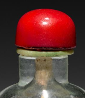 本品规格为8.4 厘米。壶体为玻璃质地,通透莹润,能清晰看到内部的纹饰。壶盖呈红色,色泽鲜艳,与通透的玻璃壶体形成鲜明的色彩对比,增添了视觉吸引力;壶盖与壶体之间有衔接部件,工艺较为精细。整体呈扁瓶状,小巧精致,是鼻烟壶的典型造型,便于手持把玩,线条流畅,比例协调,给人一种精致玲珑的感觉。采用内画工艺,在玻璃壶体内部绘制有草虫花卉纹,画面中有一只色彩鲜艳的草虫(如蝈蝈),草虫形态生动,细节刻画细腻,周围环绕着花卉、枝叶等元素,花卉色彩丰富,有红色、白色等,枝叶线条流畅。内画色彩搭配和谐,将草虫的灵动与花卉的柔美展现得淋漓尽致,具有很强的艺术感染力,体现了清代内画工艺的精湛技艺。