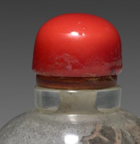 本品规格为8.4 厘米。以玻璃为壶体材质,玻璃质地通透,带有朦胧的质感,仿佛笼罩着一层薄纱。壶盖为红色,色泽鲜艳,与通透的玻璃壶体形成鲜明的色彩对比,增添了视觉吸引力;壶盖与壶体之间有木质衔接部件,丰富了材质层次。整体呈扁瓶状,小巧精致,是鼻烟壶的典型造型,便于手持把玩,线条流畅,比例协调,给人一种精致可爱的感觉。采用内画工艺,在玻璃壶体内部绘制有花鸟纹,画面中有两只鸟儿栖息于枝干上,鸟儿羽毛纹理细腻,神态生动,周围还有盛开的花朵、枝叶以及山石等元素。色彩搭配和谐,内画线条流畅自然,将花鸟的生机与柔美展现得淋漓尽致,具有很强的艺术感染力,体现了清代内画工艺的精湛技艺。