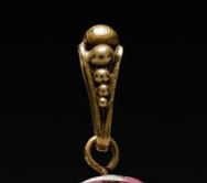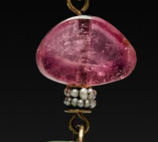 本品规格为2.6 厘米。该挂坠主体为一块翡翠,翡翠呈绿色,色泽温润,雕刻有龙纹,龙纹线条流畅,形态生动,展现出龙的矫健与威严。翡翠上方连接着一颗碧玺,碧玺呈粉红色,晶莹剔透,色泽艳丽。挂坠通过金属配件(带有精致的装饰细节)进行连接,整体设计精巧,将翡翠的温润与碧玺的艳丽相结合,色彩对比鲜明,工艺精湛,尽显清代珠宝制作的高超技艺与审美情趣。