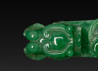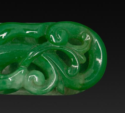 本品规格为9.6 厘米。由翡翠制成,整体呈现出浓郁鲜亮的绿色,色泽均匀,质地温润细腻,光泽感强,尽显翡翠的高贵与典雅。带钩整体呈长条状,采用镂雕工艺,雕刻有龙纹等图案。龙纹形态矫健,身姿灵动,周围辅以卷云纹等装饰,线条流畅自然,雕刻精细入微,将龙的威严与神韵刻画得栩栩如生,展现出清代玉雕工艺的高超技艺水平。