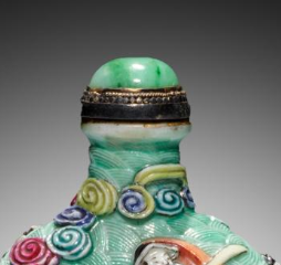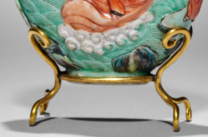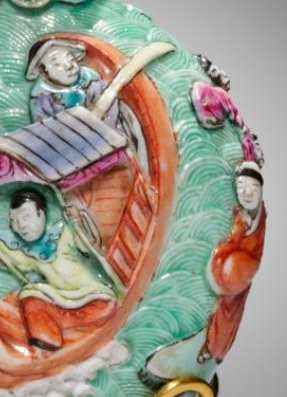 本品规格为8.4 厘米。整体呈扁瓶状,小巧精致,放置在金色的支架上,更显典雅。壶身通过堆塑和粉彩绘制展现出人物故事场景,有人物、船只、海浪、祥云等元素。人物形象生动,姿态各异,船只、海浪等细节刻画细腻,粉彩与堆塑工艺的结合,将故事场景展现得栩栩如生,具有很强的艺术表现力和叙事性。