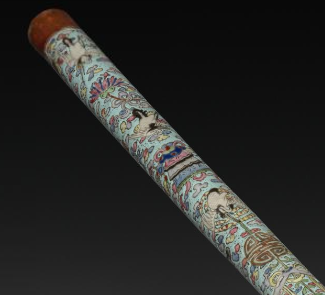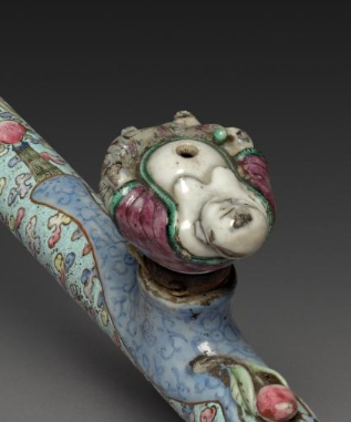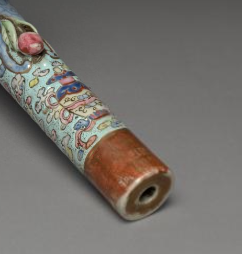 本品规格为53.4 厘米。主体为瓷质,瓷胎细腻。烟杆表面采用粉彩工艺装饰,色彩丰富艳丽,有蓝、粉、绿等多种色调,相互搭配和谐,展现出粉彩瓷特有的柔和与雅致。烟杆整体修长,呈圆柱形。烟锅部分造型独特,有类似人物或瑞兽的雕塑装饰,细节刻画生动,富有立体感。烟杆杆身绘有人物等纹饰,人物形象鲜活,周围还环绕着花卉、卷草等辅助纹样,构图精美,工艺精湛。
