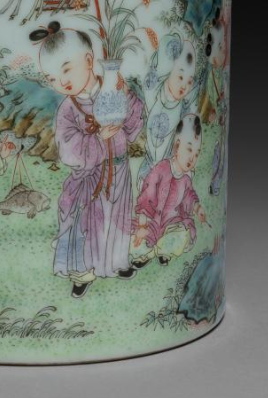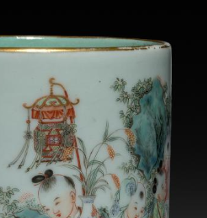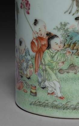 本品规格为直径9.3厘米,高度11.5厘米。以瓷为胎,胎质细腻。表面施粉彩釉,粉彩色彩丰富、柔和,有红、绿、紫、粉等多种颜色,釉面光泽亮丽,尽显粉彩瓷器的绚丽与雅致。整体呈圆柱形,为典型的笔筒造型,口沿处有描金装饰,增添了华贵感,线条简洁流畅,比例协调,方便放置毛笔等文具。笔筒外壁绘有精美的婴戏图,画面中有多个孩童,他们姿态各异,或玩耍、或互动,周围配以树木、花卉、器物等元素,场景生动活泼,充满童真与生活意趣。粉彩绘制的纹饰精细,色彩搭配和谐,将孩童的天真烂漫与周围的景致展现得淋漓尽致,体现了清代粉彩瓷器装饰工艺的精湛。