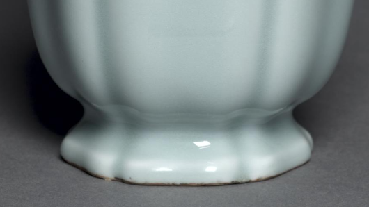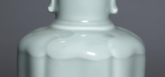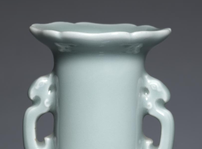本品规格为直径19.7 厘米,高度3.2厘米。整体为瓶状,瓶口呈花口形,线条优美,富有韵律;颈部两侧装饰有双螭耳,螭龙造型生动,耳部线条流畅,既起到装饰作用,又可便于搬运等;瓶身呈瓜棱形,线条圆润饱满,富有立体感;底部为花形圈足,与瓶口的花口造型相呼应,整体造型端庄典雅,比例协调。以瓷土为胎,施粉青釉。瓷胎细腻,坚实致密。粉青釉色泽淡雅柔和,呈浅淡的青绿色,釉面温润光洁,质感如青玉般莹润,给人一种清新素雅的视觉与触觉感受。