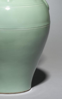 本品规格为52.1 厘米。整体呈瓶状,颈部修长,两侧有双龙形耳,龙形耳造型生动,龙首相对,仿佛在相互呼应;腹部圆润饱满,底部为圈足,造型比例协调,端庄稳重且富有独特的艺术造型感。以瓷土为胎,施粉青釉。瓷胎细腻,粉青釉色泽淡雅清新,如青竹般温润,釉面光滑莹润,质感细腻,给人一种宁静雅致的视觉感受。