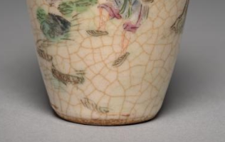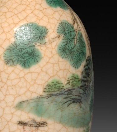 本品规格为7.7 厘米。整体呈瓶状,小巧精致,便于手持把玩。壶身绘有渔樵图,画面中有人物、山水、树木等元素。人物形象生动,或捕鱼、或行走,周围的山水树木描绘细腻,色彩淡雅,展现出一幅悠然的田园生活场景,粉彩绘制工艺精湛,细节刻画入微,与哥釉的古朴质感相互映衬,富有艺术感染力。