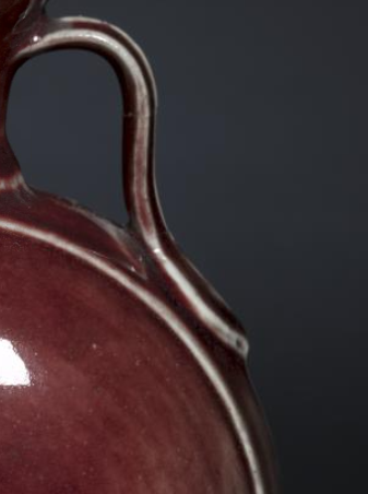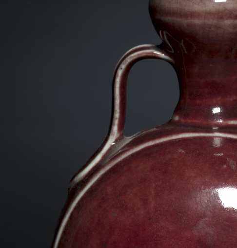 在清代,这类祭红釉绶带耳葫芦扁瓶主要作为陈设器使用。其独特的造型、艳丽的祭红釉色以及精美的绶带耳设计,使其具有极高的艺术观赏性,常被放置于宫廷、贵族府邸或文人书房等场所,用于装饰空间,彰显主人的审美品味与身份地位,是清代陶瓷艺术中兼具实用与艺术价值的代表性器物。