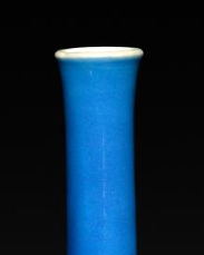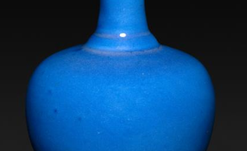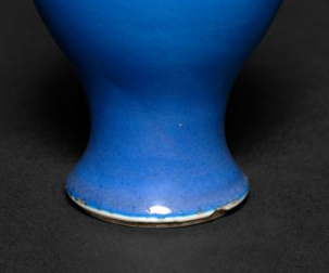 本品规格为13.1 厘米。整体呈瓶状,为典型的长颈瓶造型。颈部修长,线条挺拔;腹部圆润饱满,与修长的颈部形成鲜明对比,富有层次感与韵律感;底部为撇口形圈足,造型规整,支撑起整个瓶身,使整体造型端庄典雅。主要依靠霁蓝釉的色泽进行装饰,没有额外的彩绘或雕刻纹饰。霁蓝釉本身的浓郁色泽与莹润质感就是最好的装饰,简洁而富有韵味,体现了清代单色釉瓷器 “以釉为饰” 的审美特点。