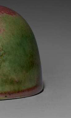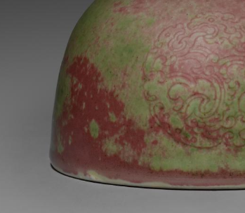 本品规格为7.4 厘米。整体造型近似半球形,为太白尊样式。施豇豆红釉,釉色呈现出豇豆红与绿色交融的美妙效果,红、绿釉色相互晕染,富有层次感与天然意趣,釉面光滑莹润。器身暗刻有螭龙纹,纹饰线条细腻流畅,螭龙形象灵动。顶部配有镂空黄杨木盖,木盖雕刻有精美的卷云等纹饰,工艺精湛,与瓷质器身搭配和谐,更添雅致。
