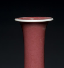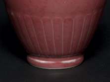 本品规格为21.2 厘米。该瓶造型修长优美,颈部细长,腹部圆润,底部为圈足。通体施豇豆红釉,釉色温润淡雅,呈现出如豇豆般的粉红色调,且釉面带有自然的窑变效果,色泽深浅不一,增添了灵动之感。瓶身下部装饰有菊瓣纹,线条流畅,将花瓣的形态刻画得细致入微,与豇豆红釉相互映衬,整体显得典雅精致,尽显清代瓷器烧制的高超技艺与审美情趣。