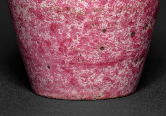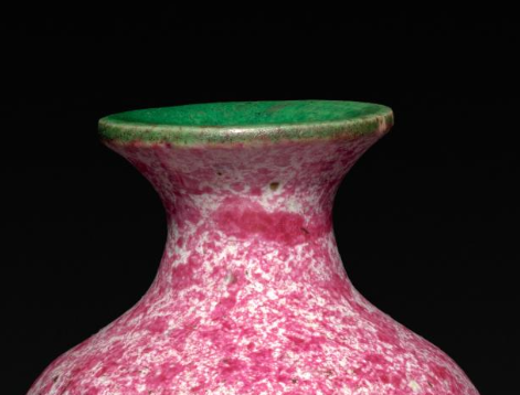 本品规格为7 厘米。整体呈瓶状,为典型的瓶类造型,颈部较细,腹部圆润,线条流畅自然,比例协调,给人一种端庄秀丽的感觉。以瓷土为胎,瓶身施豇豆红釉,口沿处施绿釉。瓷胎细腻,豇豆红釉色泽如豇豆般,呈现出淡雅的粉红色,且釉面布满天然形成的斑点、晕散等变化,富有层次感与天然意趣;绿釉色泽鲜艳,与豇豆红釉形成鲜明的色彩对比,更显精致。