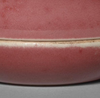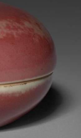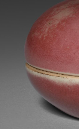 本品规格为直径7.4 厘米,高度3.9厘米。为圆形盒状,由盖和盒身两部分组成,整体造型圆润饱满。施豇豆红釉,釉色呈现出淡雅的粉红色,且釉面分布有天然形成的斑点、晕散等变化,部分区域带有绿色苔点,富有层次感与天然意趣,釉面光滑莹润,质感细腻。