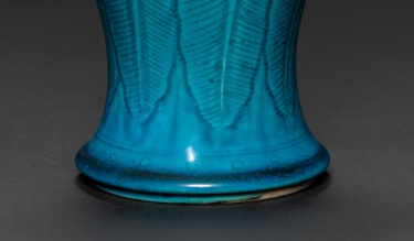本品规格为42 厘米。此梅瓶造型修长,小口、短颈、丰肩,腹部渐收,圈足,整体线条流畅优美,比例协调。瓶身施孔雀绿釉,釉色浓艳鲜亮,如孔雀羽毛般富有光泽,釉面光滑润泽。瓶身以剔刻工艺装饰牡丹纹,牡丹花朵硕大饱满,花瓣层次分明,花蕊精致,周围环绕着卷曲的枝叶,纹饰立体感强,仿佛浮雕般凸起,工艺精湛,将牡丹的雍容华贵展现得淋漓尽致,与艳丽的孔雀绿釉相得益彰,极具艺术感染力。