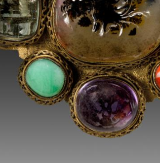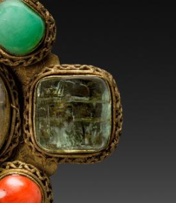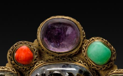 本品规格为7.7 x 7 厘米。主体以鎏金金属为框架,色泽金黄璀璨,尽显华贵。镶嵌有多种宝石,包括紫色的紫水晶、红色的珊瑚、绿色的翡翠以及透明的碧玺等,宝石质地通透,色彩艳丽,与金色框架相互映衬,视觉效果极为丰富。中间的主宝石内部雕刻有瑞兽纹样,线条细腻,形象生动。整体造型呈对称布局,中心为主宝石,周围环绕着不同形状和颜色的宝石,如圆形、方形等。金属边框采用了精细的工艺,可能有錾刻、累丝等技法,花纹繁复精美,将宝石巧妙地固定并装饰,整体设计精巧,富有层次感。