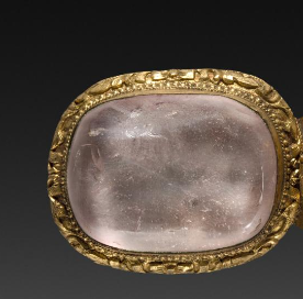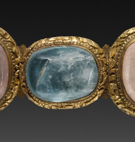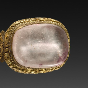 本品规格为11.5 厘米。带扣整体呈横向排列的组合式结构,由左右两个较大的部件和中间一个较小的部件组成,部件间衔接自然,便于扣合使用。主体框架为金属材质,表面经鎏金处理,呈现出华贵的金色光泽,尽显富丽堂皇之感。左右两个较大部件中镶嵌着大块的粉色宝石,宝石色泽柔和,晶体内部可见自然的纹理,质地通透;中间较小部件镶嵌有一块蓝色宝石,与两侧的粉色宝石形成鲜明的色彩对比。金属边框上雕刻有精美的花纹,工艺精湛,线条流畅,将金属的质感与宝石的光泽巧妙结合,展现出清代高超的金属工艺与宝石镶嵌技艺。