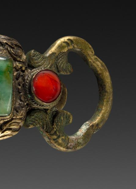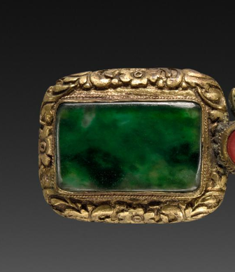 本品规格为5.2厘米。带扣整体为横向结构,由两个主要的矩形部件组成, 部件之间以带有装饰性的金属结构相连,最右侧还设有环状结构,可能用于与腰带等连接固定。主体框架由金属制成,并经过鎏金处理,呈现出富丽堂皇的金黄色泽。 两个矩形部件中,分别镶嵌着翡翠,翡翠颜色为浓郁的绿色,质地温润,带有自然的纹理和色泽变化。在翡翠旁边,各镶嵌有一颗红色的珊瑚珠,红与绿形成鲜明且和谐的色彩对比 。金属框架上雕刻有精美的花纹,可能是传统的吉祥纹饰,如卷草纹、云纹等,工艺精湛,线条细腻流畅,彰显出清代高超的金属工艺与镶嵌技艺。