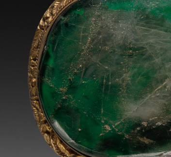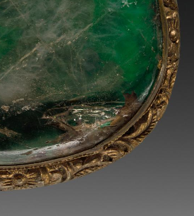 本品规格为6.1 厘米。主体框架为金属材质,表面经鎏金处理,呈现出华贵的金色光泽,色泽明亮且富有质感。带扣中心镶嵌着一颗较大的绿宝石,宝石呈现出浓郁的绿色,质地通透,带有自然的纹理与光泽,与金色的金属框架相互映衬,视觉效果华丽。整体呈椭圆形,金属边框雕刻有精美的花纹,工艺精湛,线条流畅,将绿宝石稳固地镶嵌其中,整体设计简洁大方,却又因绿宝石的点缀而显得精致华贵。