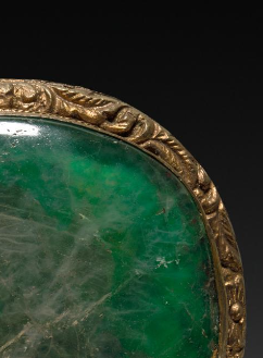 在清代,这类带扣主要用于束系腰带,是贵族或官员服饰上的重要装饰部件。它不仅具有固定腰带的实用功能,更重要的是作为身份与地位的象征。珍贵绿宝石的镶嵌以及精湛的鎏金工艺,彰显了佩戴者的高贵身份,常用于正式的礼仪场合或日常彰显身份的着装搭配中,为整体服饰增添华丽感与精致感。