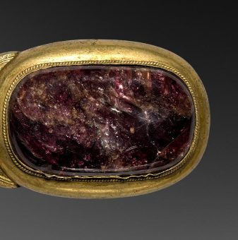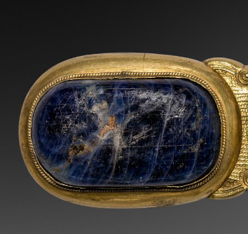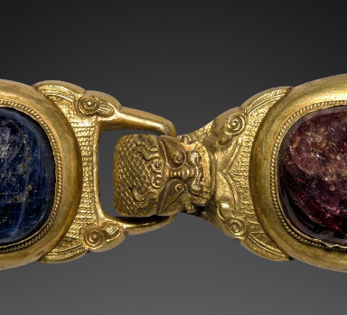 本品规格为16 厘米。主体框架由金属制成,表面经鎏金处理,呈现出耀眼且华丽的金色光泽,质感细腻,尽显华贵。带扣两侧分别镶嵌了一块宝石,一侧是深蓝色的青金石,带有自然的白色纹理,质地温润;另一侧是紫红色的碧玺,色泽浓郁,内部晶体结构在光线下闪烁着独特的光彩 。整体造型对称,呈长方形结构,通过中间的金属部件实现开合功能。鎏金边框雕刻有精美的花纹,可能是传统的云纹、花卉纹等,线条流畅细腻,工艺精湛,将青金石和碧玺完美镶嵌其中,使整个带扣显得精致且大气。