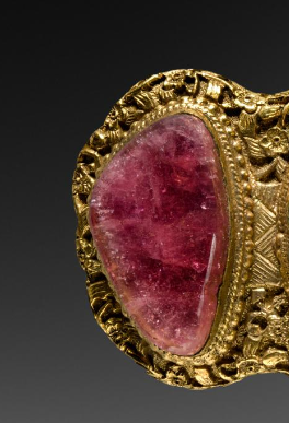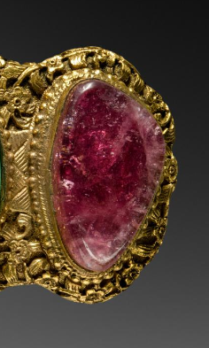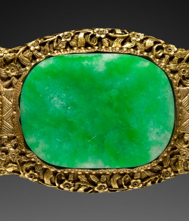 本品规格为8 厘米。主体框架为金属质地,表面经鎏金处理,呈现出耀眼且华丽的金色光泽,尽显高贵。带扣之上镶嵌有三块珍贵宝石,中间是一块色泽浓郁、质地温润的绿色翡翠,两侧则是颜色艳丽的碧玺,呈现出迷人的紫红色调。这些宝石质地通透,内部纹理自然,在光线照射下熠熠生辉,与金色框架相互映衬,形成极为绚丽的视觉效果。整体造型呈长条形,线条流畅优美。带扣的金属边框雕刻有精美的花纹,可能是传统的吉祥纹饰,如缠枝莲纹、云纹等,雕刻工艺精湛,线条细腻流畅,将翡翠和碧玺稳固且美观地镶嵌其中,使得整个带扣既富有古典韵味,又不失奢华大气之感。